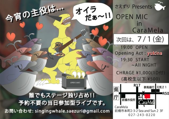 今後のオープンマイクinCaraMela http://mixi.jp/view_community.pl?id=5271297 7月は、月のはじめの金曜日 7/1(金) 19:00〜だ!! 8月は、都合により、第二土曜です 8/13(土) 19:00〜だ!! 19:00〜は、オープニングアクトyukina!! 6/19(日)さえずり『夏の祭典』にも、出演いただきました! さえずりの応援しているアーティストの一人です!! オープンマイクは、通常営業19:30〜All night!! 時間無制限!!いつ来ても、いつ帰ってもいいよ〜 オールナイトでやっちゃってもいいんだぜ〜(笑 ぞくぞくと参