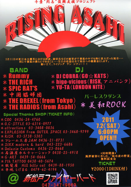 千葉の中でも被災の大きかった旭市の為に 我らが兄貴Coo Storeの宮森さんの呼びかけで 沢山のミュージシャン、アーティストらが賛同し、 今回7月2日(土)に行われる旭市復興応援チャリティープロジェクト 題して、「RISING ASAHI」を新松戸ファイヤーバードで開催します! 7月2日(土)(ナニの日) 新松戸FIRE BIRD ¥2000 (1ドリンク付き) *OPEN 18:00 START 19:00 THE RICH THE DREXEL RUmmy 中国娼婦団 RADIOS SPIC RAT’S ◆DJ DJ COBRA(GO KATS) higo-vicious(RISK, ア