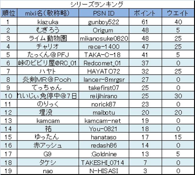 徹底したイコールコンディションでのドッグファイトを楽しむイベントその1 マーチカップシリーズ :全5戦 新規参戦者は、水曜日24時以降に参戦表明をお願いいたします。 接触なんか当たり前という方。お帰りください。 速さよりもマナー重視のイベントです。 接近戦が多いためか最近マナーの低下が見受けれます。 気持よくバトルを楽しむために無理なインへの飛び込み・幅寄せ等は厳禁でお願いいたします。 あまりに目にあまる場合は、私を含めLoveさん等が主催のイベントへの参戦をご遠慮いただく等の処置を致します。
