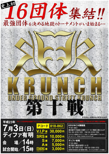 [格闘技 KRUNCH] KRUNCH 第十戦 第4弾 団体王座決定トーナメント 16団体による史上初最強の団体を決めるトーナメント 最強の称号を手にするチームをご覧あれ (今大会は1回戦のみの試合となります) 歴代団体王者 第初代 三河幕府 第二代 CARAS 第三代 野蛮一族 第四代 ? 果たして次に選ばれる団体は・・・ その他に ワンマッチ 飛び入りマッチの他にLIVE、ダンスSHOWTIMEあり 開催日時:2011年 7月 3日 日曜日 開催場所:ディファ有明 開場 /14:00