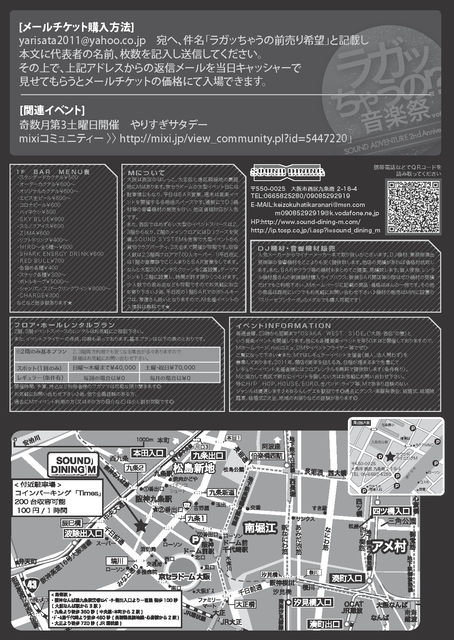 不定期開催ながら毎回100人overで盛り上がっている 「ラガッちゃうの!?音楽祭」 が7月3日日曜お昼から開催決定です! 今回はSOUND ADVENTURE 2nd Anniversaryということで 豪華出演者で開催です! SPECIAL GUESTにはNATURAL WEAPON,HISATOMI,強 TAKU-ZO SOUND HOT SIGNAL ATTACK DEM SQUAD,PUNKY,Ms.OCTOPAS,tsunakiss,CHOPPER 等日本、関西を代表する人ばかりを迎え開催です! 普段夜のクラブにはいけない方にも安心のお昼からの開催です! ぜひ遊びに来てください! 2011.7.3(Sun) ラガッちゃうの!?音楽祭 vol,5 〜SO