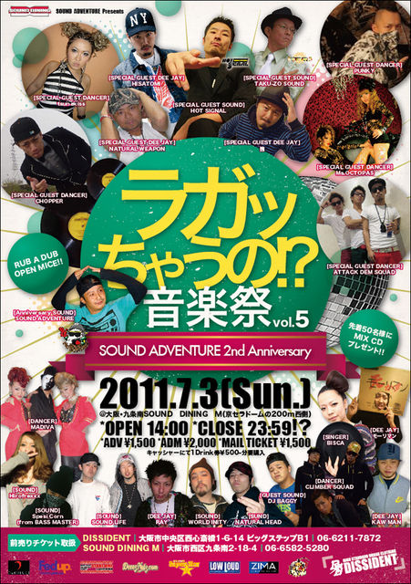 不定期開催ながら毎回100人overで盛り上がっている 「ラガッちゃうの!?音楽祭」 が7月3日日曜お昼から開催決定です! 今回はSOUND ADVENTURE 2nd Anniversaryということで 豪華出演者で開催です! SPECIAL GUESTにはNATURAL WEAPON,HISATOMI,強 TAKU-ZO SOUND HOT SIGNAL ATTACK DEM SQUAD,PUNKY,Ms.OCTOPAS,tsunakiss,CHOPPER 等日本、関西を代表する人ばかりを迎え開催です! 普段夜のクラブにはいけない方にも安心のお昼からの開催です! ぜひ遊びに来てください! 2011.7.3(Sun) ラガッちゃうの!?音楽祭 vol,5 〜