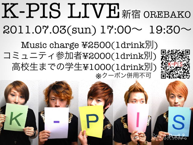 日時:7月3日(日)17:00〜(当日券 有り) 19:30〜(当日券 若干有り) ※2回公演 ※時間変更の可能性あります 場所:新宿 OREBAKO Music Charge 通常¥2500(1drink別) ※高校生までは¥1000(1drink別)(クーポン券対象外) ※K-PISコミュニティに参加して頂いたお客様は ¥2000(1drink別) 当日チケットご購入の際に20%OFFの画面を ご提示ください。 100人様限定ライブで