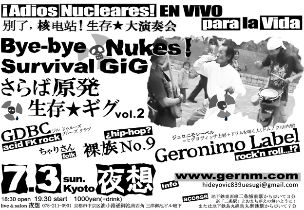 7/3(日) 「Bye-Bye Nukes! Survival GiG 〜さらば原発・サバイバル★ギグ vol.2」 出演:ジェロニモ・レーベル / GDBC(ジル・ドゥルーズ・ブルース・クラヴ)/ 裸族 No.9(路上派HIP HOP) / ちゃりさん OPEN 18:30 / START 19:00 \1000(+1drink \500)