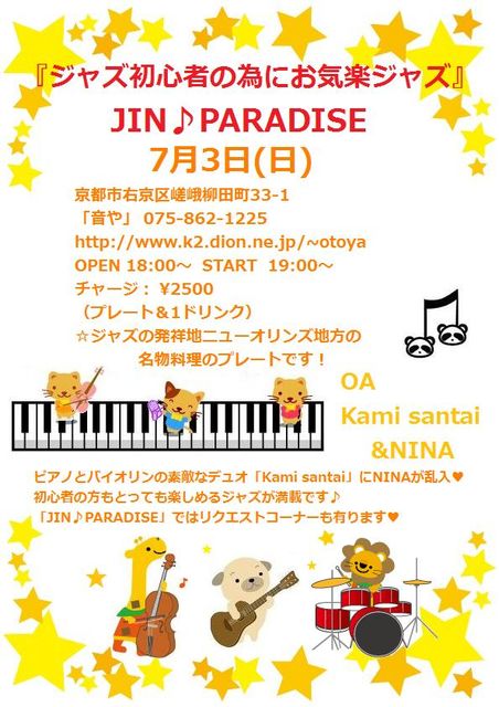 JINPARADISE (Gt:JIN Ba:AKIRA Ds:AKIHIRO) 京都市右京区嵯峨柳田町33-1 「音や」 075‐862‐1225 http://www.k2.dion.ne.jp/~otoya OPEN 18:00〜 START 19:00〜 チャージ: \2500(ニューオリンズプレート&1ドリンク) OA Kami santai &ちょっとだけNINA 初心者の方もとっても楽しめるジャズが満載です リクエストコーナーも有りますのでお楽しみに
