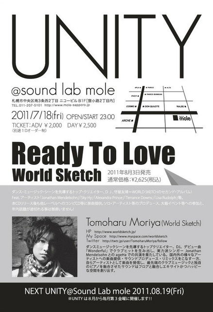 7月15日(金) CLUB MOLE REGULAR PARTY 「UNITY」 OPEN/START 23:00 ADV ¥2,000円(別途1Dオーダー制) W/F ¥2,000円(別途1Dオーダー制) DAY \3,000円 (別途1Dオーダー制) 行く人は、連絡下さい! ご入場は通常なら3,000円1ドリンク付きですが、事前にメッセージにてご予約頂ければ、 2,000円に1ドリンク付きでご入場頂けるディスカウントをご用意致します おおまかなご来場予定の人数と代表者様のお名前を明記しまして、お気軽にメッセージ下さい