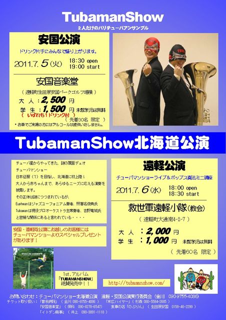 吹奏楽愛好者、ユーフォニアム奏者、テューバ奏者なら知っている、 「TubamanShow」が北海道にやってくる。 7月5日安国公演を皮切りに、6日遠軽、以降旭川、札幌、函館と北海道ツアーを 行います。 安国、遠軽公演の詳細は以下の通りです。 ☆7月5日(火)【安国公演】 開場18時30分開演19時00分 【料金】大人2,500円、学生1,500円(ワンドリンク付) (先着30名限定) 【会場】安国音楽堂(遠軽町生田原安国) 遠軽町生田原安国パークゴルフ場横 【備考】ワンドリンクはアルコール有りです。 ☆