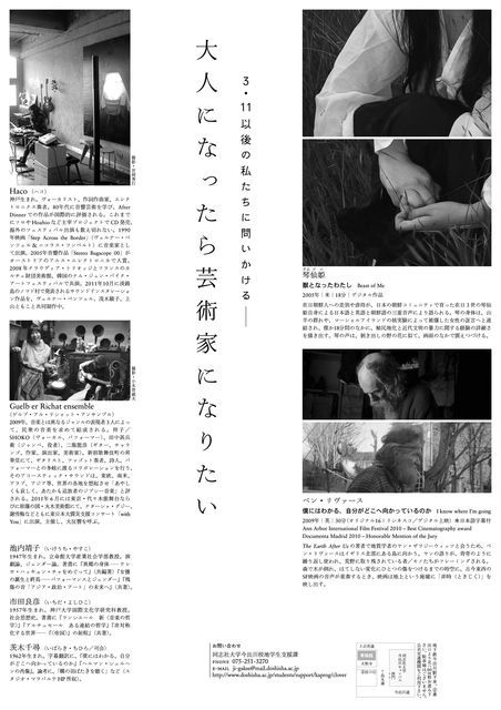 ●映画+音楽+シンポジウムの夕べ 緊急企画「大人になったら芸術家になりたい」 【会期】2011年7月5日(火) 17:30より 入場無料 ※イベント詳細は、studio malaparteサイトへ↓ http://1st.geocities.jp/mothermonika/index/indee1.html <スケジュール> 17:00 開場 17:30 - 18:20 上映1:琴仙姫 (クムソニ) 『獣となったわたし』 Beast of Me 2005年/米/18分 上映2:ベン・リヴァース『僕にはわかる、自分がどこへ向かっているのか』 I know where I'm going 2009年/英/30分(オリジナル16ミリシネスコ)*日本語字幕付