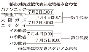 第82回都市対抗野球大会 近畿地区代表決定戦 2011年7月2日(土)、4日(月)、5日(火) 予備日7/6水 わかさスタジアム京都 ---- 3日目(7/5火) 敗者復活代表決定戦 10:00→13:00 パナソニック[二の勝者] 対 大阪ガス[ハの敗者] (勝者は本大会へ)