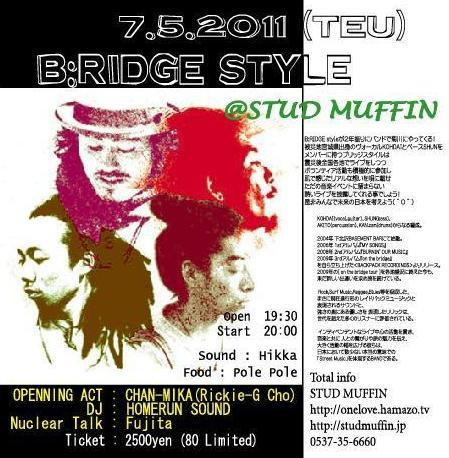 管理人様失礼致します チェケラープリーズ 7月5日(火)です! 時間は20:00〜 前売り当日どっちも2500円(80人限定) みなさんスケジュールの確認をお願い致します(^0^) タイトルは『日本の未来を考えよう!』です! (変更するかもだけどニュアンスはそんな感じっす) アーティストはB:RIDGE styleです! バンドでは2年振りになりますね(><) 追加でアーティストChanMika決定!!! (Rickie-GのChorus)がソロで決定っす(^^) そしてDJ Homerun soundも追加で盛り上
