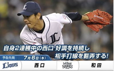 西武ドーム 18:00 予告先発 西口 文也(西武)防御率:2.83 3勝3敗0分 和田 毅(ソフトバンク)防御率:2.00 6勝1敗0分 対ソフトバンク:2勝5敗