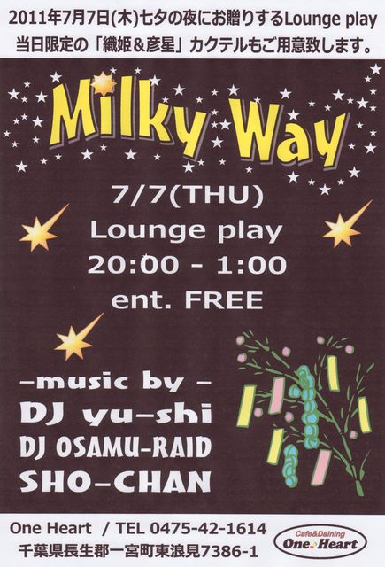 『Milky Way』 2011.7.7(THU) 20:00 - 1:00 @One Heart entrance=free music by DJ yu→shi (XTRABLEND) DJ OSAMU-RAID (clutch) SHO-CHAN (One Heart) 七夕の夜に相応しいメロウな選曲中心にお贈りするラウンジナイトです。 当日限定の「織姫&彦星カクテル」などご用意してお待ちしております。 お時間ある方は是非ご来店くださいねー!
