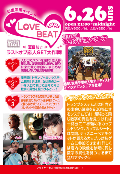 7月8日渋谷ELF(エルフ)にて LOVE J-POP NIGHT 毎月第2金曜開催 毎回1000人越えのラブビートの姉妹イベントです !! 入り口で4種類のカラーバンドを選択 してもらっての入場 詳しくはこちらでチェック http://ameblo.jp/lovebeat-kitene/ ゲストには 超話題イベントのJ-POP NIGHTからカラテカ入江が登場 DJには 日本テレビ『歌スタ』にウタイビトハンターにも出演したTEN(LADY BiRD ) フジテレビ「あいのり」に登場した嵐 元米米CLUBのメ