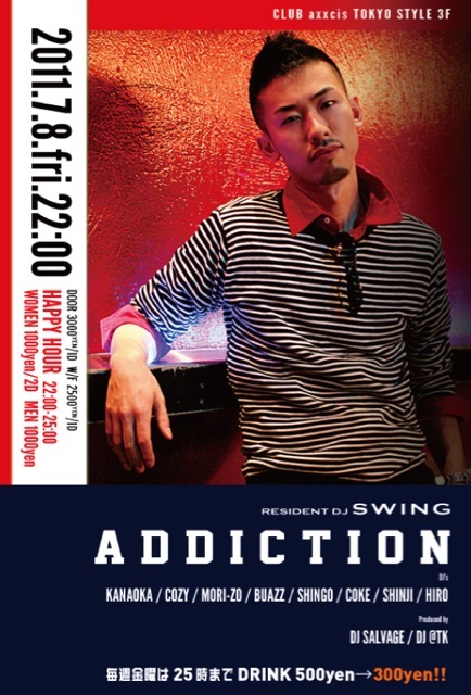 豪華DJ陣に加えて、都内最安値で遊べちゃいます☆ 今夜のクラブ遊びはaxxcisで決まり ゲスト取れますので是非ご連絡下さいっ ☆07/08(FRI) Tokyo Style 2F「PLAYERZ PARK」 3F「Addiction」 @渋谷axxcis OPEN 22:00 DISCOUNT エントランスでサルベージのゲスト「アキ」と伝えて頂ければ以下の価格で入場頂けます☆ 22:00-25:00 MEN 1000yen WOMEN 1000yen/2D DRINK 500yen→300yen 毎週金曜は25時までDRINK 500yen→300yen!! 25:00- 1000yen ■2F PLAYE
