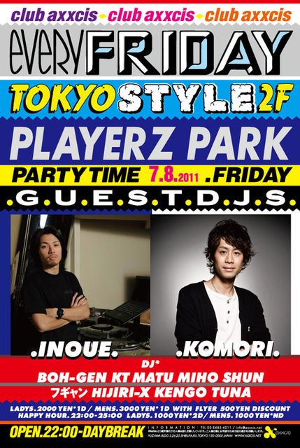管理人様告知失礼致します 7月8日、渋谷AXXCISの金曜の看板イベントPLAYERZ PARKのお得なゲストのご案内です 第二週目のゲストDJはHARLEMのKINGS COURTでもお馴染みのDJ INOUE、そしてR&Bの貴公子DJ KOMORIです しかも1時までドリンクが300円 今週も盛り上がる事間違いなし毎週大盛況のPLAYERS PARKを是非体感しに来てみて下さい ゲスト希望の方はお名前と人数をそえてメッセージ送って頂ければゲストお取り致します またエントランスにてDJ KT(ケーティー)の