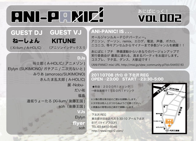 前回大盛況から二ケ月、堂々のあにぱにっく!vol.2発動! オールジャンルAーPOPパーティー。 (アニソン、ゲーソン、remix、ERG、電波、声優、ボカロ、ニコニコ、 等々アンセムからマイナーまで多数ジャンルを網羅!!) ゲストになんとアニソンインデックス!からVJKITUNE、 A-HOL!C/Xi-liumからDJねーしょんを迎えで実行委員会が 最高に滾れる、高まるパーティをお届けします。 コスプレ、ヲタ芸、ダンス、大歓迎、楽しみ方は自由です! そして今回は特集3本立てでお送りします!! ・一足お先に夏を先取
