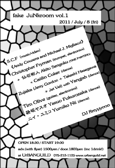管理人さま、告知させて下さい 7.8 (fri) fake JuNkroom vol.1 S.C.F(music/video)《Andy Couzens and Michael J. Migliacci》 http://spasticchildrensfund.blogspot.com/ Christopher Fryman (trumpet, electronics)+仙石彬人Akito Sengoku (TIME PAINTING)+ Caitlin Coker(dance) http://www.myspace.com/christopherfryman http://akitosengoku.blogspot.com/ Zujaka (Jerry Gordon +Takashi Hasegawa+Jet Vel) with Yangjah http://3cmpress.blogspot.com/ http://emptybody.exblog.jp/ tim olive http://tim