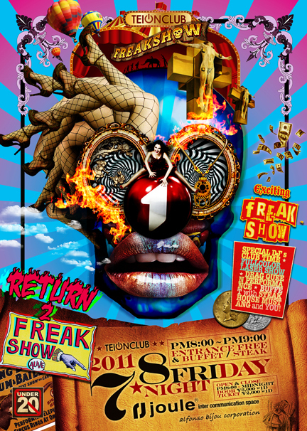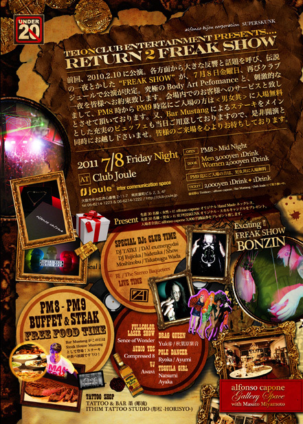 管理人様、告知失礼致します。 teiONclub Entertainment presents RETURN 2 FREAKSHOW 日程 : 2011年7月8日 (金曜日) 場所 : 心斎橋 CLUB JOULE < http://www.club-joule.co.jp/ > 時間 : 開演 / PM 8:00 終演 / Midnight 料金 : 当日 男性 / 3,000円 1ドリンク付 当日 女性 / 2,000円 1ドリンク付 割引 : フライヤー持参 / 2,500円 1ドリンク付 前売りチケット / 2,000円 2ドリンク付 teiONclub メンバーズカード持参 / 2,000円 1ドリンク付