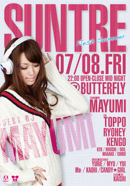 告知失礼します バタフライの第2金曜日は毎回大盛況の鉄板パーティ!!!! サントレ!!!! 次回のサントレは7/8(金) ゲストにDJ MAYUMIさんを迎えての開催が決定!!!! ■DJ MAYUMIオフィシャルHP■ PC : http://www.djmayumi.jp モバイル : http://www.djmayumi.jp/mobile/ ■DJ MAYUMI Blog■http://ameblo.jp/djmayumi/ ■DJ MAYUMI twitter■http://twitter.com/#!/DJMAYUMI ■DJ MAYUMI FACEBOOK■http://www.facebook.com/pages/DJ-Mayumi/280835116311 ■DJ MAYUMI MySpace■http://www.mys