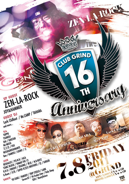 2011.7.8 (金) @GRIND “CLUB GRiND 16th Anniversary!!” OPEN22:00 - CLOSE5:00 ◇ADV /2,000円(+1D) ◇DOOR /3,000円(+1D) 【SPECIAL GUEST LIVE】 ZEN-LA-ROCK JOY & HAMMER 【GUEST DJ】 Lark Chillout Mr.CAMP TAHARA 【LIVE】 ■孫GONG from BACK BONE ■華音 from BACK BONE ■BESHALIST ■P.D.N.R ■AICA ■STARZ BLOCK ■YAMAO THE 12 ■R.D.O ■KNIGHT ■N.B BOYZ ■G-Roots