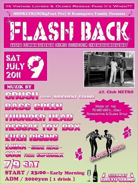 管理人様告知させていただきます^^ WhaaGwaan!? 今回で7回目のフラッシュバック!!! 毎回ノリは最高で、雰囲気もまるでジャマイカの田舎(CONTRY)を意識した 温かく、マイルド、時に熱く、時にCOOL!!!! 来たら必ず、踊れないあなたも揺れているに違いない!!! 昔のDANCE HALLは誰でも踊れて、踊りに決まりなんてなくて自由に楽しめました^^ そんな昔のダンスを再現できたらいいなと思い企画したのが「FLASH BACK」 毎回見てると誰もが踊りっぱなしで凄く嬉しいです^^ また今回も皆で懐かしい曲と懐かし