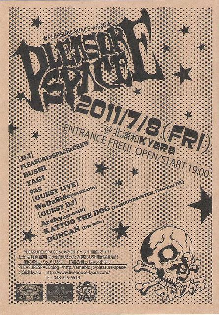 どもっ!BU$HIっす! 皆様アチィ日をお過ごしですよね? そんな日はキンキンに冷やしたアルコールを グビグビっと呑ャりたくなるでしょ? さらに気持ち良い音なんかあったら文句無し(笑) そんな夜をプレスペがご提案!! では詳細です! ★PLEASURE SPACE vol.28★ 2011年7月8日(金) @北浦和KYARA ENTRANCE FREE START 19:00 【DJ】 PLEASURExSPACExCREW BU$HI YAGI 925 【GUEST LIVE】 WaDaSide(MARYANN) 【GUEST DJ】 Archy(NO☆GAIN) KATTOO THE DOG (164SOUNDSYSTEM、Valentine DX) DUNCAN (irie tribe)