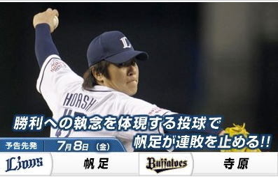 西武ドーム 18:00 予告先発 帆足 和幸(西武)防御率:2.70 4勝2敗0分 寺原 隼人(オリックス)防御率:2.84 8勝4敗0分 対オリックス:3勝3敗