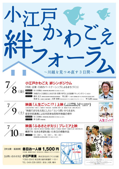 管理人様、不適切な場合は、お手数ですが、削除願います。 ふるさと川越を見つめ直す市民参加型企画 〜映画ふるさとがえり完成記念〜 「小江戸かわごえ 絆フォーラム」 http://www.fireworks-film.com/?p=2821 【日程】 7月8日(金)〜7月10日(日) 【会場】 小江戸 蔵里(こえど くらり) http://www.machikawa.co.jp/ ■アクセス http://www.machikawa.co.jp/access/ 【実施内容】 ●7月8日(金)18:00〜 小江戸かわごえ 絆シンポジウム 「市民・企業・行政のパ