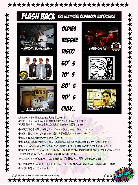 WhaaGwaan!? 今回で7回目のフラッシュバック!!! 毎回ノリは最高で、雰囲気もまるでジャマイカの田舎(CONTRY)を意識した 温かく、マイルド、時に熱く、時にCOOL!!!! 来たら必ず、踊れないあなたも揺れているに違いない!!! 昔のDANCE HALLは誰でも踊れて、踊りに決まりなんてなくて自由に楽しめました^^ そんな昔のダンスを再現できたらいいなと思い企画したのが「FLASH BACK」 毎回見てると誰もが踊りっぱなしで凄く嬉しいです^^ また今回も皆で懐かしい曲と懐かしいリズムで当時のJAMAICAや聴きはじめの頃に