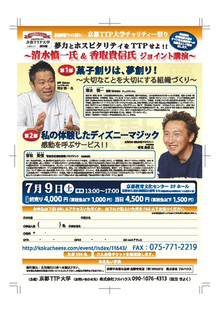 夢ケーキパティシエ清水慎一氏が京都で講演を!! 夢力とホスピタリティをTTPせよ!! 第一部 菓子創りは夢創り 〜大切なことを大切にする組織ずくり〜 菓匠 Shimizu シェフパティシエ 清水 慎一氏 第二部 私の体験したディズ二―マジック 〜感動を呼ぶサービス〜 香取感動マネジメント 代表取締役 香取 貴信氏 参加費 前売り4,000円(高校生以下1,000円) *法人様まとめ買い割引ございます お問い合わせ下