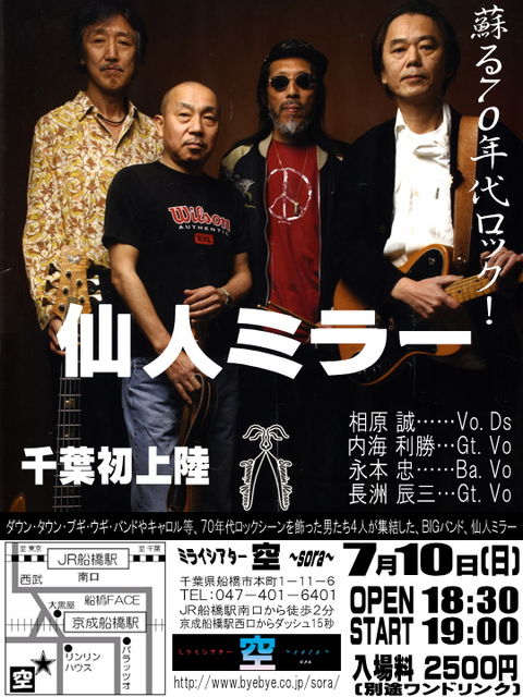 7月10日(日)、千葉 船橋にて仙人ミラーのライヴがあります。 ここは元ストリップ劇場とのこと、その名残が諸処に見られたりします。 そんな異空間で、ぜひ4人の仙人のスゴさを体感してください! メンバーそれぞれ、いろんなバンドで活動してますが、 仙人ミラーでは、どこまでも自由。 人々を巻き込み、惹き付ける力、そして言葉と音の深さはこのメンバーならでは! だと思います。 どうぞご期待下さい! ★ 7/10(日)ミライシアター空~SORA~ → http://www.byebye.co.jp/sora/pc/ ◆ 仙人ミラー 千葉 初上陸