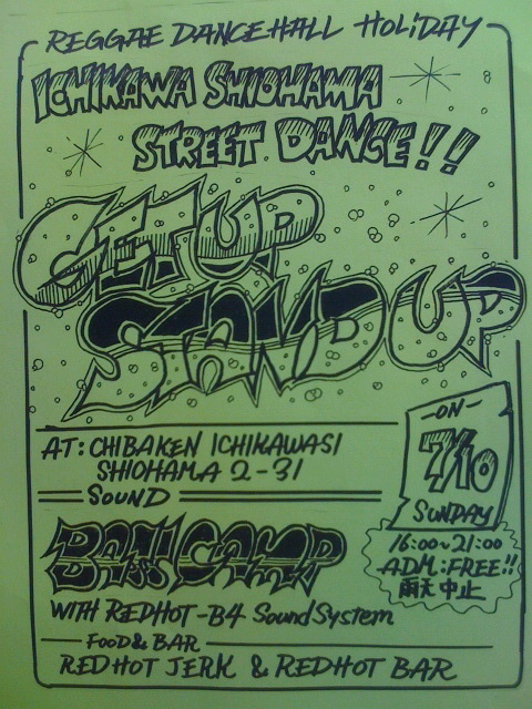 告知 失礼します。 毎日 暑い日が続いてますが...。ハイ、本格的に野外シーズン到来ですね。。 つーことで夕方からヤッてます!! 早い時間はアナログにてプレイ!! Oldies,Soul.Disco.Rocksteadyはもちろん 80s.90s.Dancehallから最先端Brand Newまでチェックしながら道路上で楽しめる 前代未聞の野外ダンスGET UP STAND UP!!!!!!!! フロアーはもちろんアスファルト! 女の子はヒールでも大丈夫♪ 是非お洒落して遊びに来てください!! 皆さんのご来場お待ちしております!! 【市川塩浜路上ダンス】 〜GET
