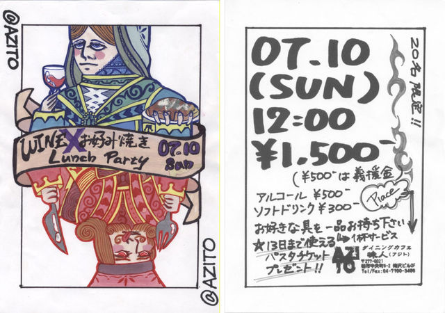 昼下がりのお好み焼きランチパーティー 〜WINEに合うお好み焼きを食べよう〜 ▼場所 Dining Cafe AZITO 千葉県柏市中央町6−2 2F JR柏駅東口下車徒歩7分 ▼日時 7月10日(日) 12:00 AZITO集合 13:00 お好み焼きスタート 16:00 終了 ▼会費 \1,500 (\500は義援金) ▼ドリンク アルコール \500 ソフトドリンク \300 ▼内容 野菜たっぷりもOK シーフードもOK チーズも明太子もOK 定番のお好み焼きレシピは捨ててユニークで新しいお好み焼きを作りマショ⌒★ ワインに合いそうな具を1品お持ち下さい