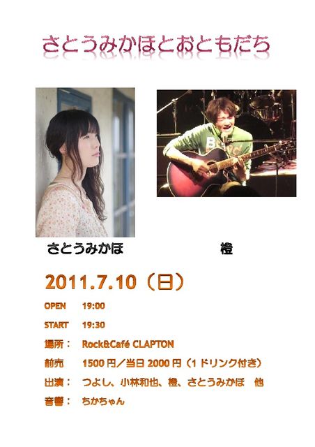 7月11日(日)PM7:30スタート 『さとうみかほとおともだち』 ミュージックチャージ 前売1500円/当日2000円(ワンドリンク付)