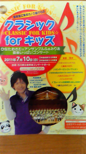 0才から入場できる楽しいコンサートのお知らせです。 2011年7月10日(日) 石川県立音楽堂コンサートホール 午前の部 10:30開演 午後の部 13:30開演 全席自由 入場料金500円 ☆0才から入場可能 ☆2才以下のお子様は無料 元「NHK BSおかあさんといっしょ」の歌のお兄さん ひなたおさむさんとアンサンブル☆ふぁみりあによる 楽しいキッズコンサートです! チケット取り扱い 音楽堂チケットボックス (076)232−8632 https://yyk1.ka-ruku.com/ishikawa-t/index.jsp?type=N&id=B110