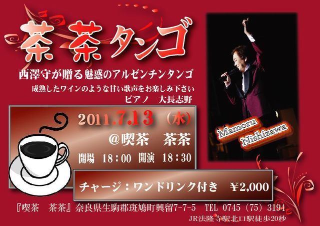 7月13日(水) 西澤守が贈る魅惑のアルゼンチンタンゴ @喫茶 茶茶 奈良県生駒郡斑鳩町興留7-7-5 レディースファッションCECIL2階 JR法隆寺駅北口 徒歩20秒 0745-74-6178(お問い合わせ、予約) 開場 18:00 開演 18:30 演奏 大長志野(ピアノ) チャージ 2000円 ワンドリンク付き お席に限りがございますので、ご予約はお早めにお願い致します〜!