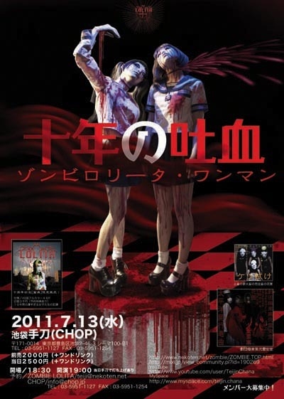 2011.7.13(水)池袋手刀で10周年(実質12年)ワンマンを決行します。 前売り2000円 当日2500円(前売り当日ともワンドリンクがプラスされます) 開場 18:30 開演 19:00 選りすぐりのゾンロリ団が集結し、いつもと絶対違うライブをします。 なお終了後は手刀で打ち上げです!! 出演バンド解説/ 血ミドロ双子/ふたごの死美人トークがおもしろい! 塔野みぞれがポリープの手術なのでお休み前の摩訶不思議なかわいらしさを是非! 少女サバト/斬り込みセーラー服!乙女ちゃんのギター姿が拝めます。 ゾンロリ