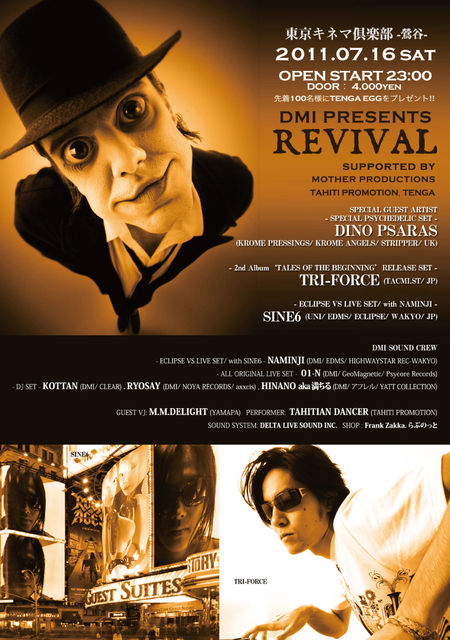 管理人様、告知失礼致します。 ◆2010年笑福祭以来となる【 DMI 】のSPECIAL CLUB NIGHTが再始動!!◆ 復活となる会場、東京キネマ倶楽部に【 DINO PSARAS 】【 TRI-FORCE 】【 SINE6 】が出演!! http://www.clubberia.com/events/180850/ http://www.iflyer.jp/event/85713 UK・ブライトンでCARL COX達とDJのキャリアをスタートし、今やサイケデリックシーンでは唯一無二の世界観を放つ、至高のストーリーテラー【 DINO PSARAS 】★ 盟友SHANTI、DADOと共に結成した‘KROME ANGELS’でもその存在感は抜群の人気を誇り、今回約4年振りの復