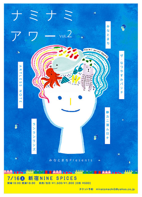 みなとまち自主企画第2段です!! みなとまち Presents "ナミナミアワー vol.2" @新宿Nine Spices Open: 18:00 / Start: 18:30 adv: 1500 / door: 1800 +1D ■みなとまち HP: http://minatomachi.jimdo.com/ Myspace: http://www.myspace.com/minatomachi ■ザ・なつやすみバンド HP: http://natsuyasumi.hiyamugi.com/ Myspace: http://www.myspace.com/thenatsuyasumiband ■ARTLESS NOTE HP: http://www.geocities.jp/artlessnote/top.html Myspace: http://www.myspace.com/artlessnote ■静カニ潜ム日々 H