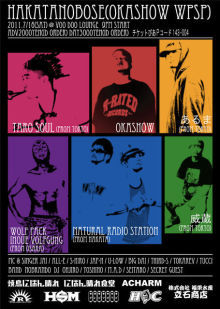 《HAKATANOBOSE(OKASHOW☆WPSP) 》 2011.7.16(土) @Voodoo Lounge OPEN 9:00 チケット料金 前売り2000円[1ドリンク要オーダー] 当日3000円[1ドリンク要オーダー] 出演者 SPゲスト. TARO SOULDJ&威蔵(東京) あるま(東京) WOLF PACK の井上ヴォルフガング(大阪) NaturalRadioStation(博多) ALL→E Jai S-HERO NoBrando JAP-H U-LOW BIG DAI TOKAREV TUCCI THIRD-S DJ OHJ