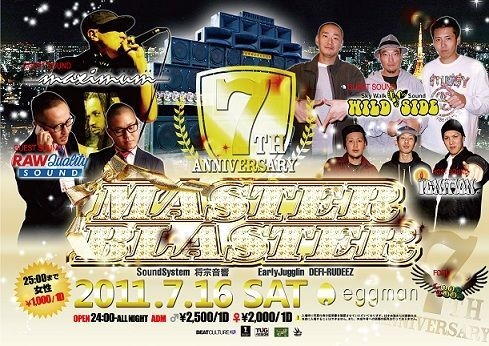 管理人様告知させていただきます。 ☆MASTER BLASTER☆ -7th ANNIVERSARY- 2011/7/16(sat) @渋谷eggman Guest Sound/ ★MAXIMUM ★WILD SIDE ★RAWQUALITY Host Sound/ ☆IGNITION Earley Jugglin by/ ☆DEFI-RUDEEZ Sound System/ ☆将宗音響 24:00〜ALL NIGHT 【ADM】 男性¥2500/1D 女性¥2000/1D ★25:00までに入場された女性は¥1000/1D!!!!! 顔写真付きIDをお持ちでない方、18歳未満の方、高校生の方のご入場はお断りさせていただきます。 今月は前回中止となったMASTER BLASTER 7周年アニバーサリー