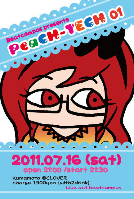 TECHNO-HOUSE-ELECTRO Party Beatcampus presents PeaCH-TECH 01 ■日時 2011年7月16日(土) ■場所 熊本CLOVER 860-0803 熊本市新市街3-24 ステージファイブビル3階 096-288-3346 http://bit.ly/jMDkub ■時間 21:00 open 21:30 start ■料金 \1500(2ドリンク付き) ■ジャンル TECHNO-HOUSE-ELECTRO ■ Live act Beatcampus ■DJs (ABC..) daiske (Perfume☆熊本) HAL-44 M.O.L.吉 (tricoMODE) PJ RAITEF DJ Ray (dear drop record) Yuya☆ (HOUSE入門) ... and more ■VJ