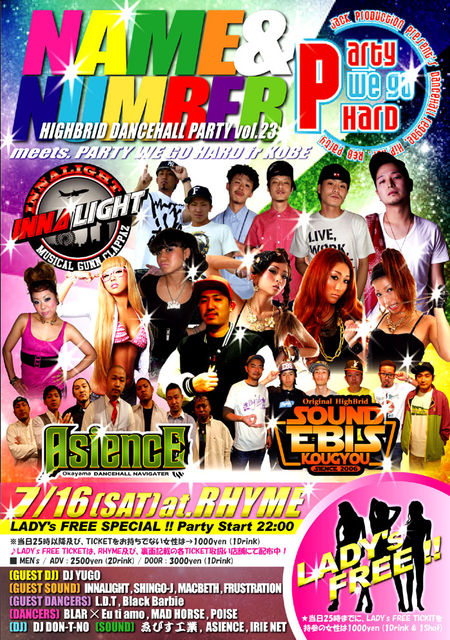 管理人様 告知失礼いたします! 【NAME & NUMBER vol.23】 meets. PARTY WE GO HARD from Kobe ★LADY's FREE SPECIAL★ 2011-07-16 (SAT) at.RHYME START 22:00 【GUEST DJ】 DJ YUGO 【GUEST SOUND】  INNALIGHT SHINGO-J MACBETH FRUSTRATION 【GUEST DANCERS】 L.D.T Black Barbie 【DJ】 DJ DON-T-NO 【SOUND】 ゑびす工業 ASIENCE IRIE NET 【DANCERS】 BLAR × Eu ti amo MAD HORSE  POISE ◆TICKET INFORMATION◆ ■LADY's ★当日25時までに、LADY's FREE TICKET持