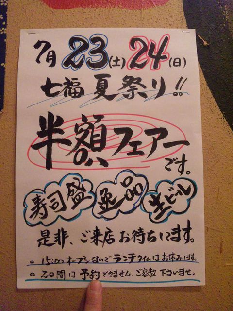 画像はマイミクさんの所から許可なくカッパラッて来ました 寿司盛逸品生ビール 半額です 半額です 半額です 半額です 半額です またまた七福食堂15:00OPEN 昼間っから半額で飲みたい人、この指止〜まれっ ----------キ-----------リ-----------ト-----------リ----------- 上記内容は変更し、下記内容で開催いたします。 開催場所 : いろり屋 開催時間 : 19:00〜 御都合の付く方、宜しくお願いしますね〜
