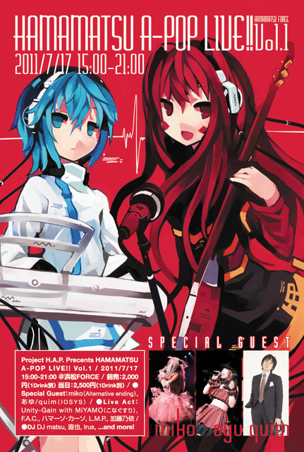 Project H.A.P.が送る新イベント第2弾! 次はライブイベントだ!!! ガチなバンドユニットに、アイドルライブまで! 縦ノリ、オタ芸、拳を突き上げる等、楽しみ方は自由! スペシャルゲストアクトに、 「チルノのパーフェクトさんすう教室」や「ひれ伏せ愚民どもっ!」の歌唱アーティストでおなじみの miko(Alternative ending) また上記の東方Projectを初めとした多くの楽曲を排出しているIOSYSより あゆ/quim(IOSYS) の合計3名が再び来浜!!!! また今回は地元大学生のアニソンバンドや、 萌カフェスタジオ ルチェンテより、メイ