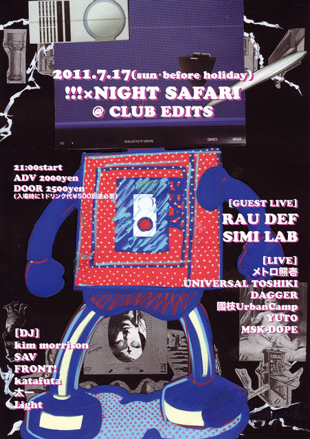 管理人様、告知失礼します!! 前売りチケットご希望の方は気軽にメッセージ下さい。 2011.7.17(sun・before holiday) 『!!!×NIGHTSAFARI』 @ CLUB EDITS 21:00start adv/2000yen door/2500yen (入場時別途1DRINK500円必要) [GUEST LIVE] RAU DEF SIMI LAB [LIVE] メトロ熊壱 UNIVERSAL TOSHIKI DAGGER 國枝UrbanCamp YUTO MSK-DOPE [DJ] kim morrison SAV FRONT!(DOPE TOKE) katafuta(浸蝕) 太一 Light and more club EDITS http://www.edits.jp/pc/access/edits_acces