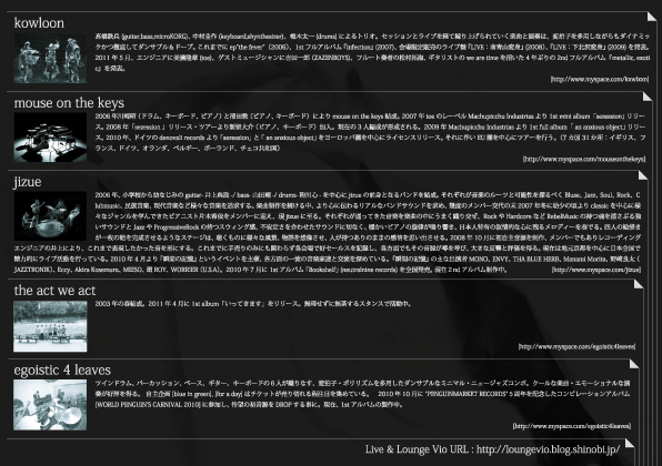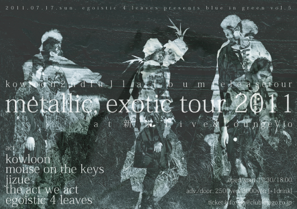 告知失礼します。 ホテルニュートーキョーの中村圭作氏が参加しているkowloonのライブ告知です。 ■企画:egoistic 4 leaves presents "blue in green vol.5" 〜metallic, exotic tour 2011〜 ■日時:7月17日(日)◆開場17:30~ ◆開演18:00~ ■会場:名古屋 新栄Live & Lounge Vio ■料金:前売券2,500円/当日券3,000円(P:139-378 L:42493)※220枚限定 (ドリンク代500円が別途必要になります。) ※入場料の内100円はTJG311(東北地方太平洋沖地震支援団体)を通して 「NPOみんつな」に寄付させて頂きます