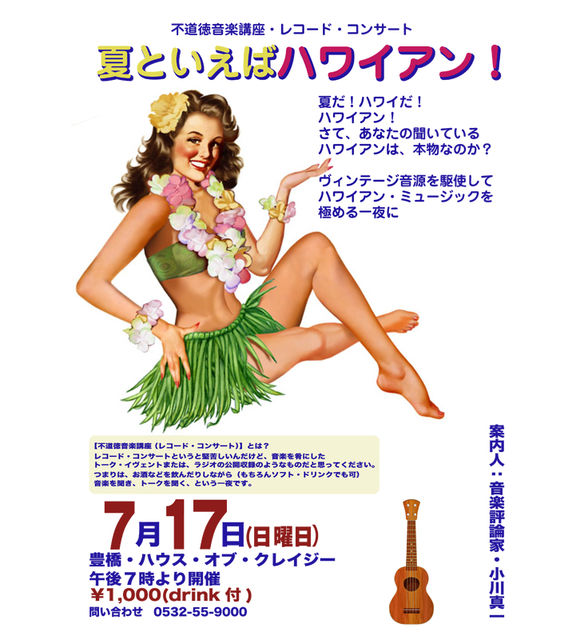 レココン11弾「夏といえばハワイアン!」 ---------------------------------------------------------------- 夏だ!ハワイだ! ハワイアン! さて、あなたの聴いている ハワイアンは、本物なのか? ヴィンテージ音源を駆使して ハワイアン・ミュージックを 極める一夜に 不道徳音楽講座 (レコード・コンサート) 案内人:音楽評論家・小川真一 ---------------------------------------------------------------- 7月17日(日曜日) 豊橋・ハウス・オブ・クレイジー 午後7時より開催