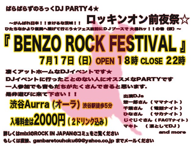 延期となっていた「四巴」、7/17(日)の開催が決定しました!! ロクジゲン、でぃすあに、超級覇王電影弾、天挑五輪DIVE會。 新宿を拠点とする四つのイベントが激突! 時間も19時〜5時に増量!! ものどもよ、つどえ。 よつどもえ! 四巴-yotsudomoe- [日時] 2011-07-17(sun) 19:00-05:00 [料金] \2000(1d)/mixi:\1500(1d) [DJs] ゲスト: GERU-C閣下(ota96/皿師屋) くくり(ヲタリズム/ANISON 199X) ロクジゲン: youthaqua MAY-E U8 でぃすあに: POGI しずか 千尋