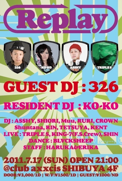 7月17日(日)祝前日 東京歌謡曲ナイト×Replay @渋谷axxcis OPEN:[2.3F]21:00[4F]22:00 エントランスで 【DJこーこのゲストでリプレイ】 と言っていただければ、 何時でも何人でも 男女1000円 の特別ディスカウント料金で入場できます★